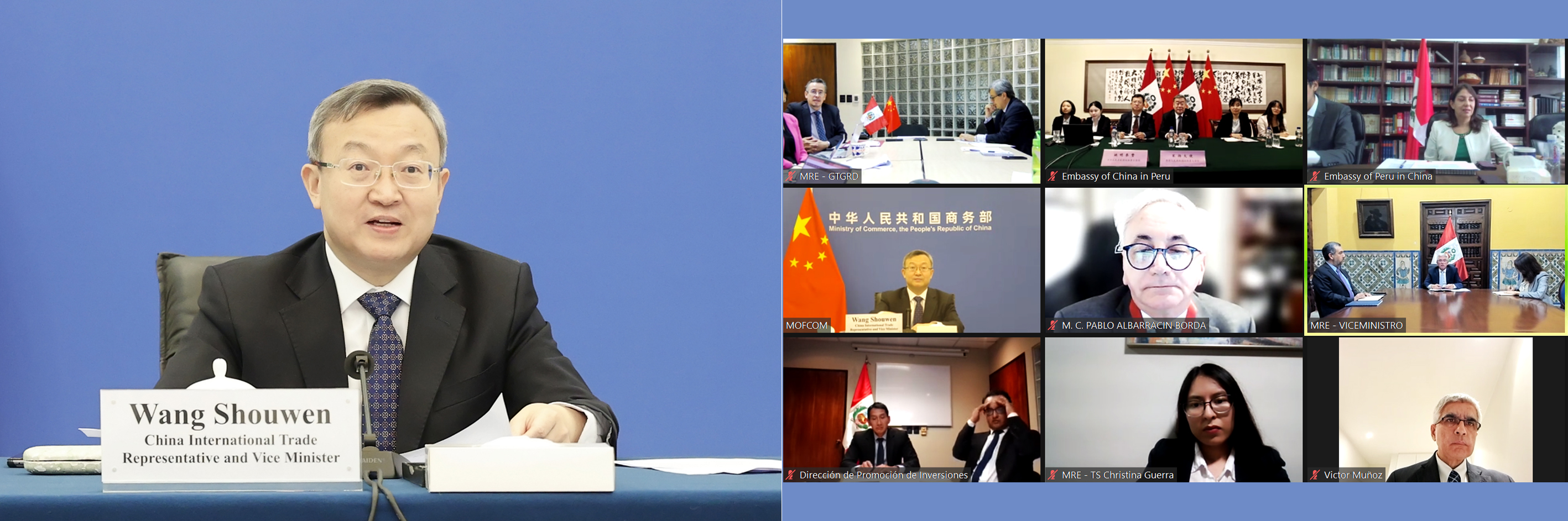 4月30日,商务部国际贸易谈判代表(正部长级)兼副部长王受文与秘鲁外交部副部长卡米诺以视频方式共同出席中秘经贸混委会第八次会议开幕式。